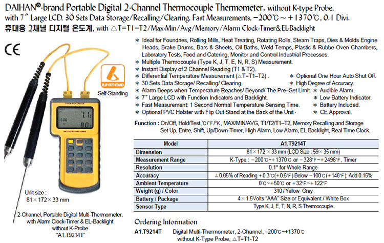 Portable Digital 2-Channel Thermocouple Thermometer, without K-type Probe,with 7' Large LCD, 30 Sets